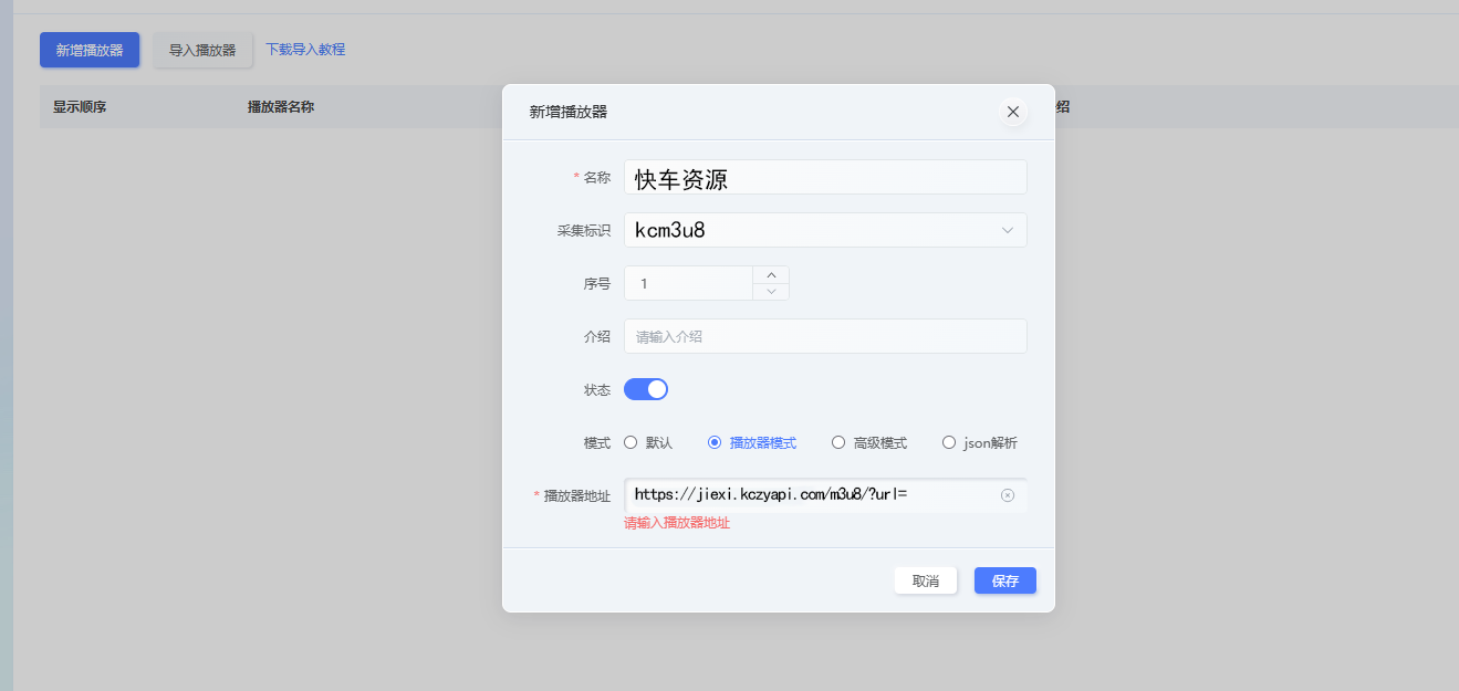 请按以下步骤进行:依次点击【视频】-【播放器设置】,然后在【添加播放器来源】依次输入